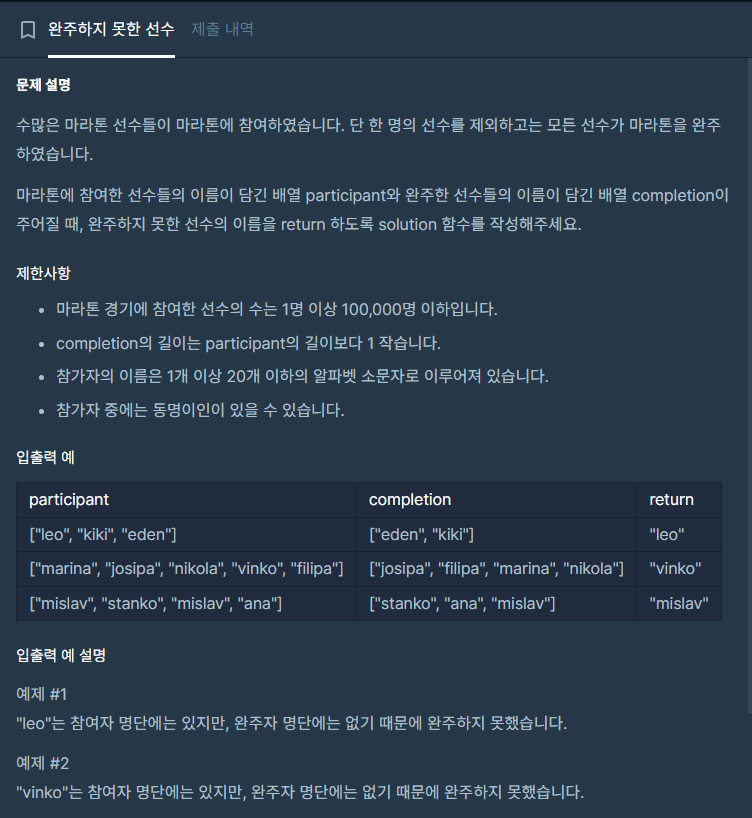 참가자 이름과 완주자이름을 비교하여 완주하지못한 사람을 찾으면 된다.