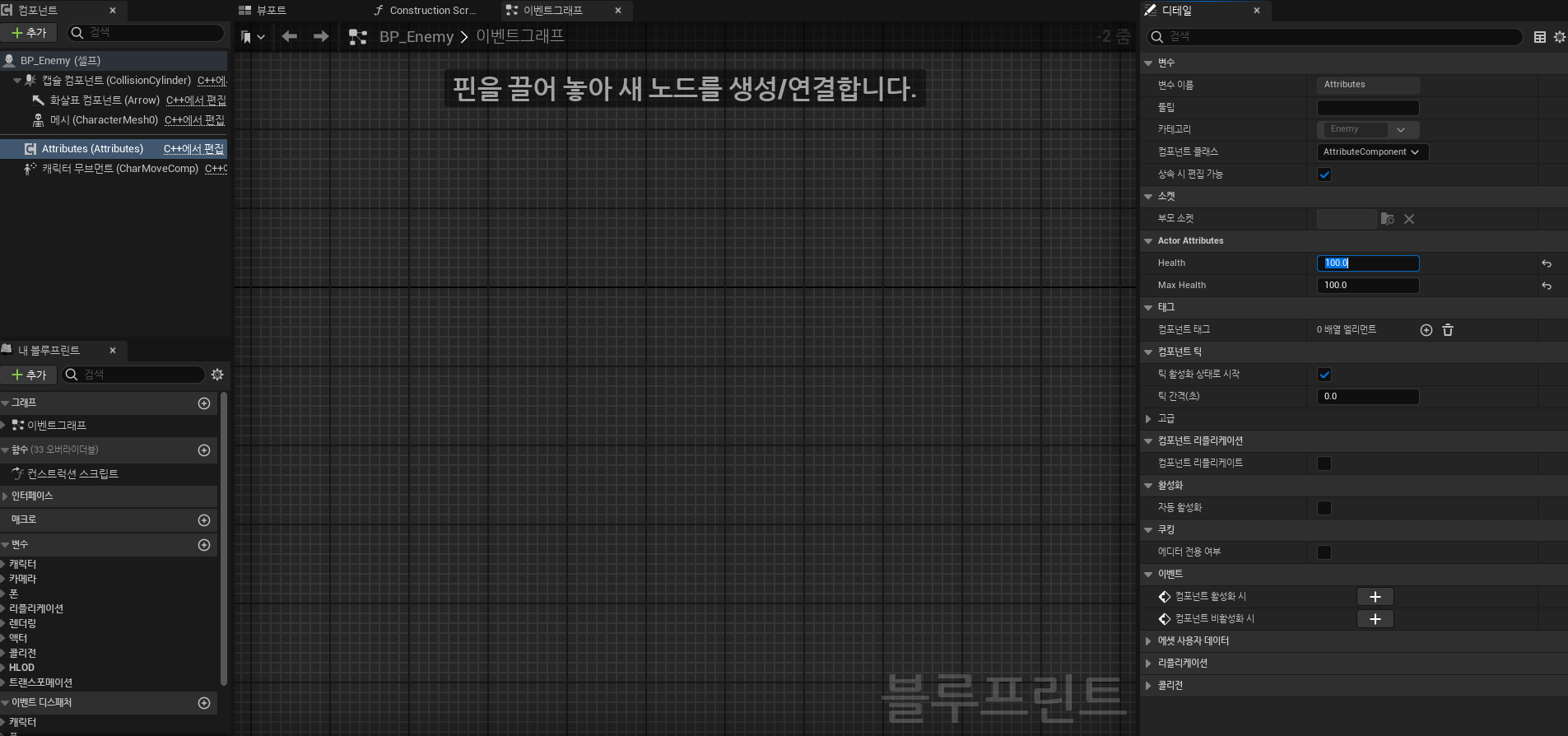 그리고 게임에 필요한 UI는 UI_Game으로 묶어서 관리해주도록 했다. 옵저버 패턴을 사용하여 시간이 지남에 따라 색깔이 바뀌고 슬라이더의 바가 줄어들도록 구현했다. 이때 각 오브젝트의 이름과 Bind하는 enum 변수들의 이름이 같아야 정상적으로 Bind가 이루어진다.