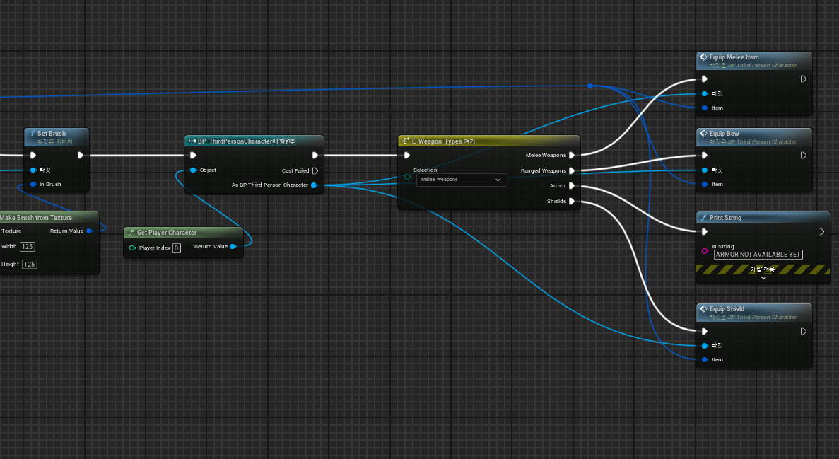 그리고 들어오는 아이템 타입에 따라 다른 이벤트가 호출되도록 스위치문을 구성해준다. 현재 아머는 없어서 그냥 스트링만 출력하도록 했다.