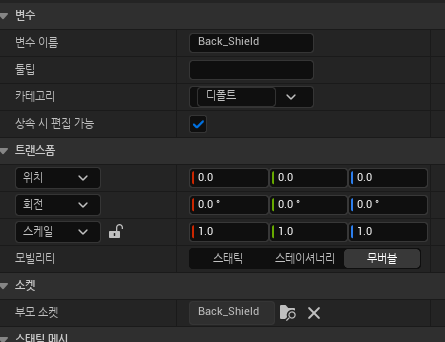 DB 테이블에 방패를 추가해주고 스태틱매쉬와 소캣을 맞게 수정해준다.