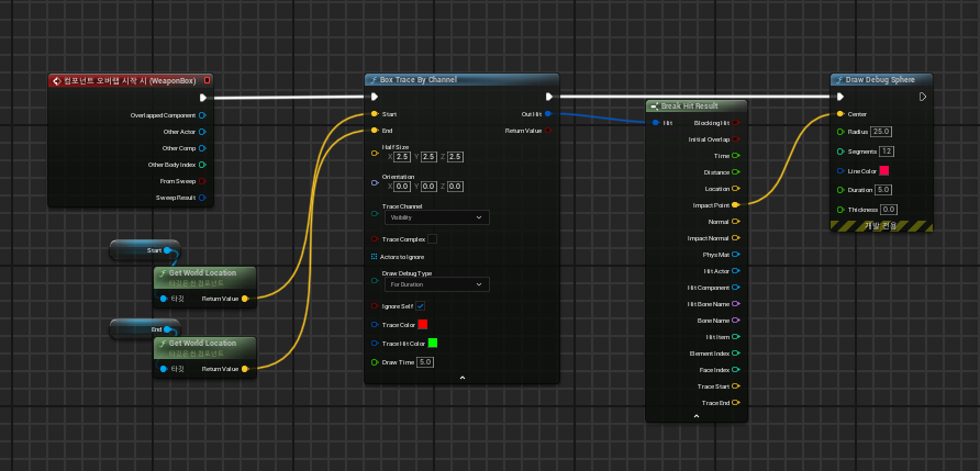 콜백함수에서는 Start End를 가지고 UKismetSystemLibrary::BoxTraceSingle 함수를 사용하여 Box Collision이 발생하는