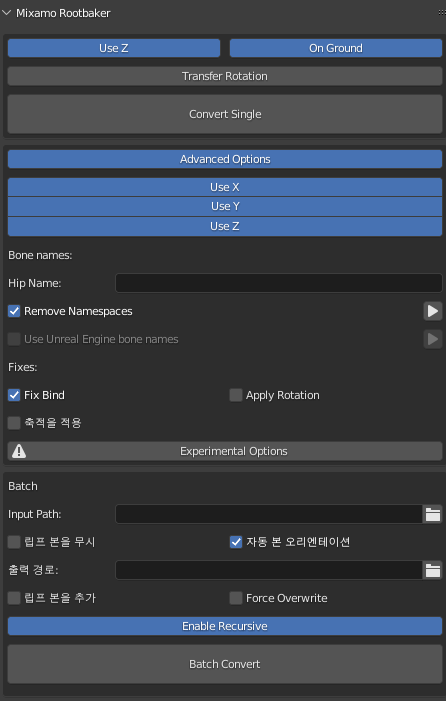 다운받아준 다음 Blender를 열고 mixamo 사이드탭을 열어준다. 설정값은 다음과 같다. Input Path에 다운받은 폴더를 넣어주고 Output Path는 Convert된 값이 들어갈 곳으로 원하는 폴더를 지정해주면 된다. 설정해준 다음 Convert해주자.