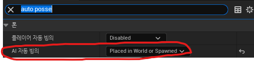 이때 AI 컨트롤러가 적이 Spawn했을 때도 잘 작동하게 하기위해 디테일창에서 AI자동 빙의를 수정해주자
