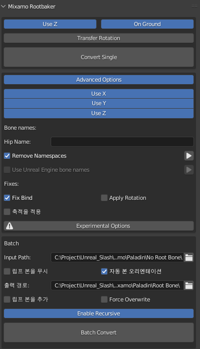 적이 움직일 때 애니메이션을 추가해주자 애니메이션은 Mixamo에서 추가해주자. 이때 Blender를 통해 Root본을 추가해주는 작업을 해주어야한다. 이때 폴더에 하나의 with Skin Animation이 존재해야 다른 것에도 일괄적으로 자동 적용이 된다.