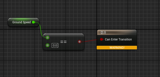 이때 Land -> OnGround 트랜지션 조건을 추가하고 여기에 Get Relevant Anim Time과 Ground Speed의 bool 연산으로 실행시간이 일정초를 넘고 걷고 있다면 OnGround로 넘어가게 했다.