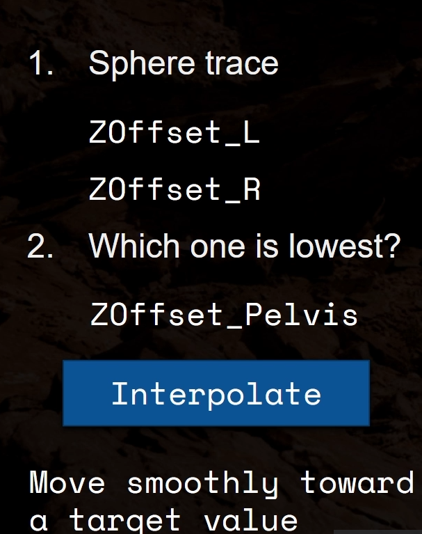 일단 발의 위치에서 일정구간 구로 Trace해서 Trace가 Hit되는 곳의 좌표를 벡터로 반환해주는 함수를 만들어주자