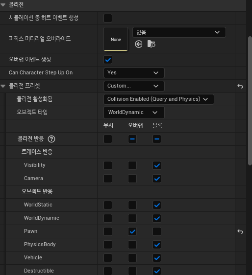모든 충돌이 가능한 객체는 충돌 섹션이 있다. 그리고 오늘 여기서 주의 깊게 볼 것은 콜리전 프리셋이다.