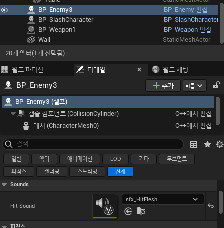 이것을 적이 가지고 있다가 재생할 수 있게 코드상에서 변수로 지정해주자. 그리고 피격당했을 때 소리가 재생되도록