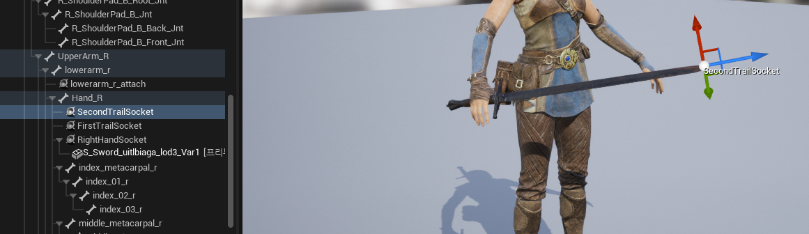 이를 위해 캐릭터의 스켈레톤 오른손에 소켓 2개를 추가해주자. 검의 시작과 끝에 위치시켜주면 된다.
