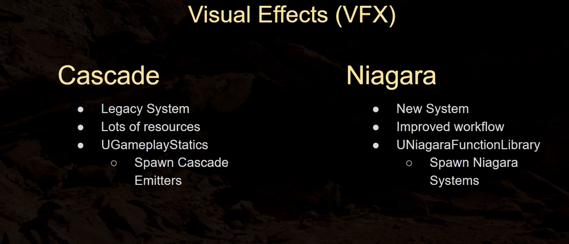 언리얼에서 VFX 시각 이펙트는 Cascade와 Niagara가 있는데 나이아가라가 최신 시스템이지만 둘다 다룰줄 알아야한다.