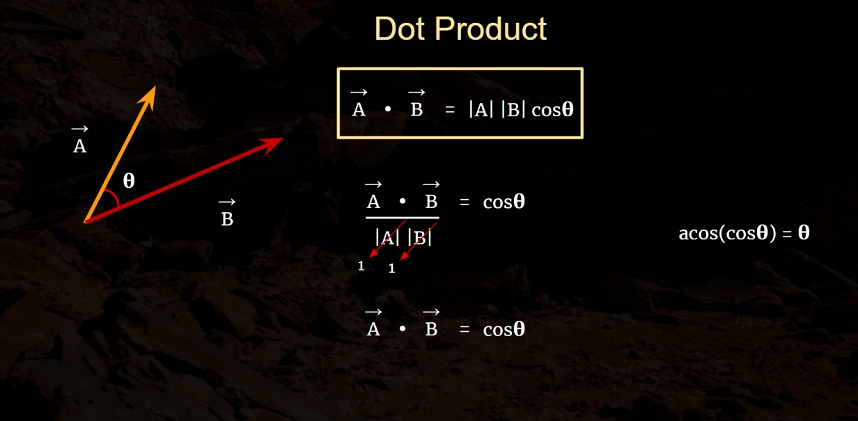 내적을 했을 때의 공식에서 만약 A와 B의 크기가 Normalize이 된다면 즉 1이 된다면 Cos값을 알 수 있다.이 값을 역 코사인 함수를 취해서 각을 알아내면 된다.