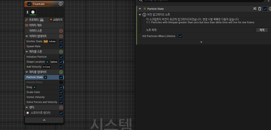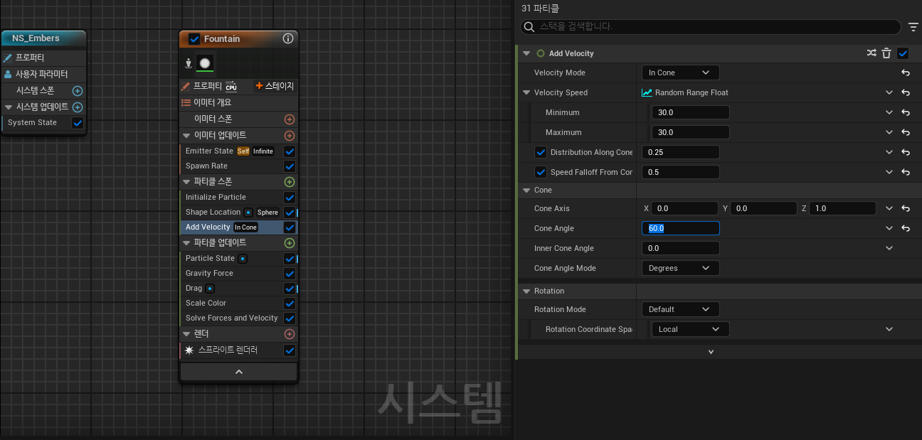 여기에 약간의 효과를 추가해보자 이번에는 이펙트에 나이아가라 시스템을 사용해볼 것이다.