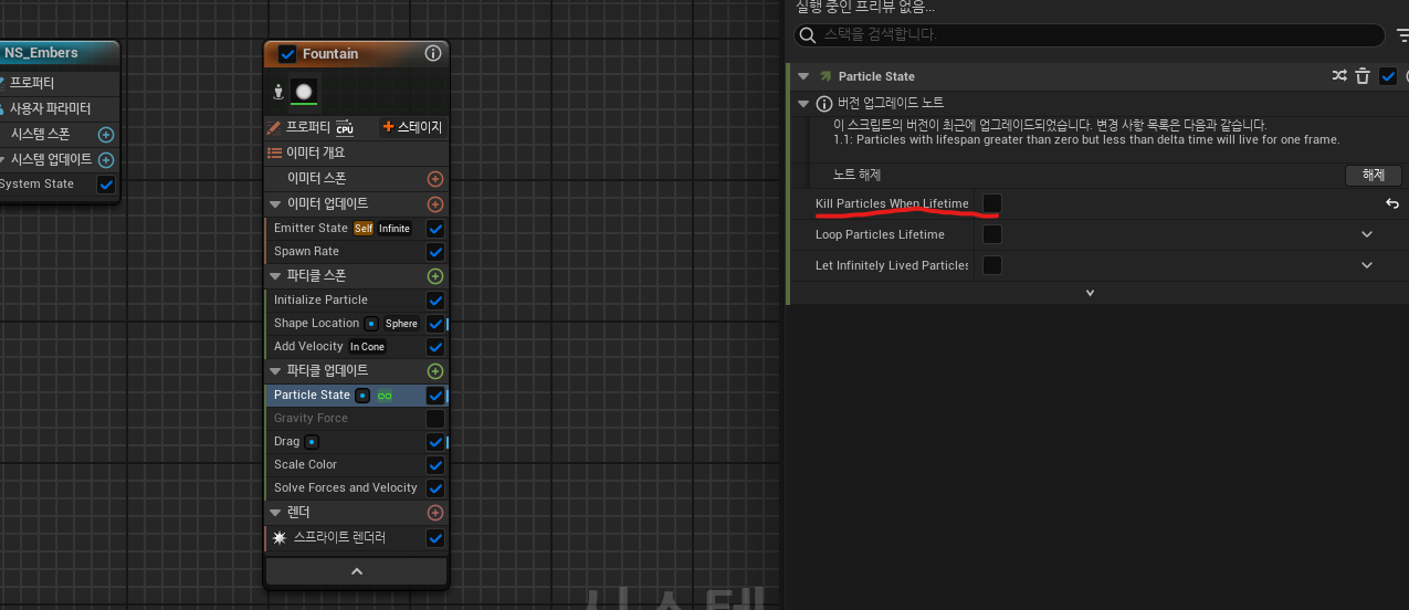 그리고 이 이펙트가 자동으로 종료되는 것이 아닌 우리가 종료시키고 싶기 때문에 Kill Particles를 해제해준다.