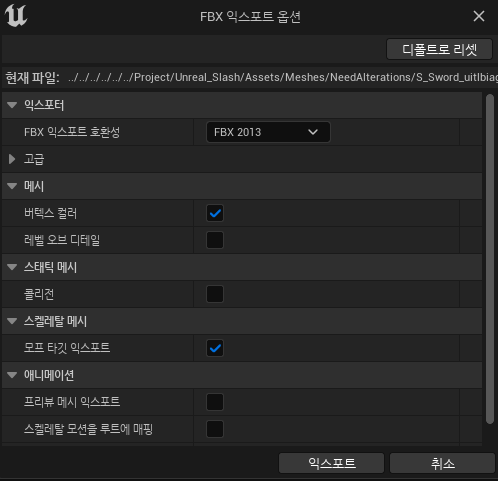 이렇게 된 무기들의 원점을 동일하게 바꿔주어야하는데 이를 위해 Blender를 사용하자. Blendor에서 사용하려면 해당 에셋을 Export해주어야한다.