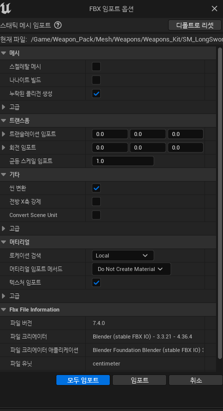 마지막으로 크기는 S키를 누르면 변경할 수있다. 완성된 fbx파일은 이름을 기존 것과 다르게 해준 다음 다시 언리얼에서 임폴트 해주자.
