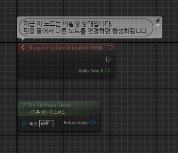 애니메이션 블루프린트의 이벤트 그래프를 보면 두가지가 기본적으로 있는 것을 볼 수 있는데 Try Get Pawn Owner은 이 애니메이션 블루프린트를 사용하는 객체를 가져올 수 있는 것이고 Blueprint Update Animation은 Tick 이벤트와 비슷하게 작동하는 것이다.