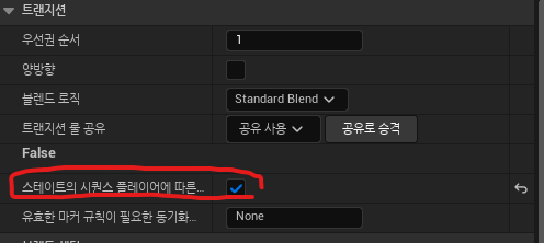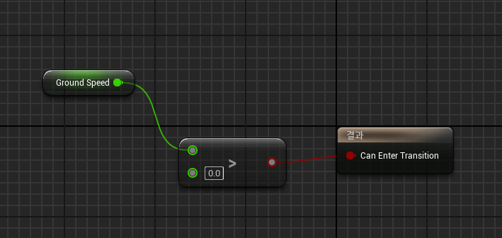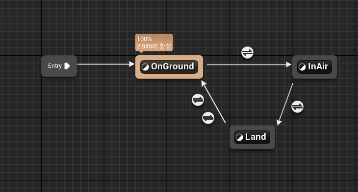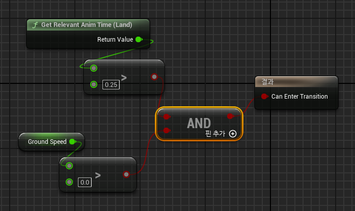 이때 Land -> OnGround 트랜지션 조건을 추가하고 여기에 Get Relevant Anim Time과 Ground Speed의 bool 연산으로 실행시간이 일정초를 넘고 걷고 있다면 OnGround로 넘어가게 했다.