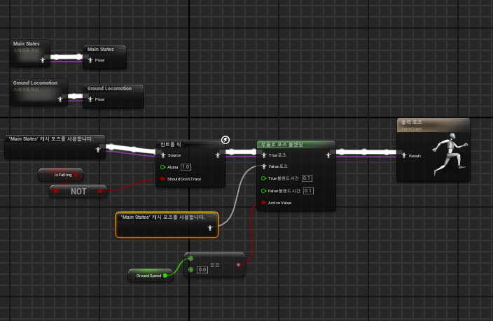 이제 애니메이션 블루프린트에서 실제로 사용하면 된다. 이때 Blend 기능과 bool을 통해 떨어지고 있을때와 이동하고