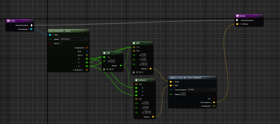 일단 발의 위치에서 일정구간 구로 Trace해서 Trace가 Hit되는 곳의 좌표를 벡터로 반환해주는 함수를 만들어주자